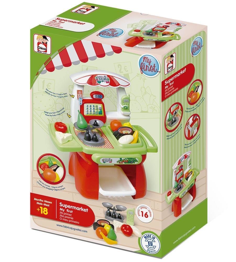Supermarket jest fantastycznym zestawem dla każdego malucha, który lubi bawić się w sklep. Składa się profesjonalnego i kompleksowo wyposażonego stanowiska dla kasjera, przy którym znajduje się kasa i waga z doważnikami. . W zestawie również znajdują się półeczki do eksponowania towarów na sprzedaż, 16 akcesoriów (np. owoce, warzywa, produkty gotowe).