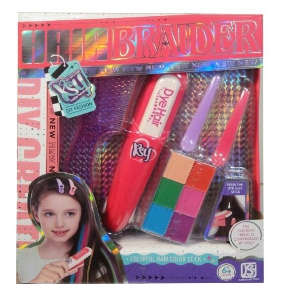 Prostownica z kredą do farbowania włosów. W zestawie dołączono także spinki i grzebień. Kreda jest zmywalna. Produkt zapakowany w kartonowe opakowanie. Zabawka dla dzieci od 6 lat. Podane wymiary są wymiarami opakowania.
