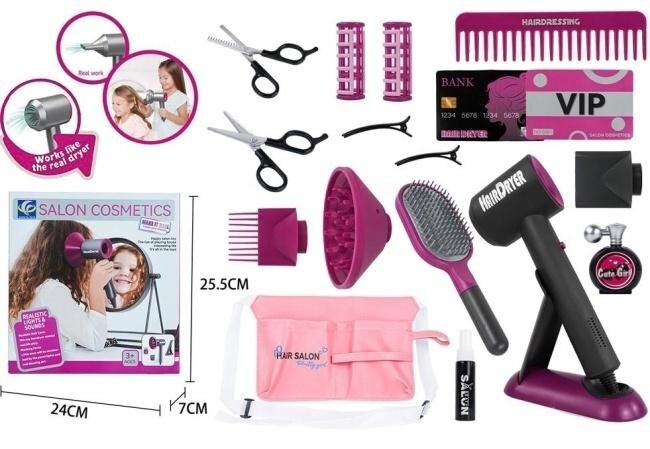 Odkryj Świat Fryzjerskich Przygód z Zestawem Salon Fryzjerski! Czy Twoje dziecko marzy o zostaniu stylistą fryzur? Ten fantastyczny zestaw do zabawy w salon piękności to idealny sposób na rozbudzenie kreatywności i wyobraźni! Zawiera wszystko, czego mały fryzjer potrzebuje do tworzenia niesamowitych fryzur dla swoich lalek, misiów, a może nawet dla Ciebie! Realistyczne Elementy dla Autentycznej Zabawy: W zestawie znajdziesz realistycznie wyglądającą suszarkę, która nie tylko przypomina prawdziwą, ale także wydaje dźwięki i lekko dmucha, co dodaje zabawie autentyczności i sprawia, że dziecko poczuje się jak w prawdziwym salonie. Bezpieczne dla dzieci nożyczki pozwolą na precyzyjne "cięcie" włosów, a różnorodne szczotki i grzebienie pomogą w rozczesywaniu i stylizacji. Mnogość Akcesoriów do Kreatywnych Stylizacji: Do dyspozycji małego stylisty są także dwa rodzaje wałków do tworzenia loków i fal, a także spinki do włosów, które utrzymają każdą fryzurę na miejscu. Dodatkowa nakładka - dyfuzor do suszarki urozmaici zabawę w stylizację. Praktyczny Fartuszek i Salonowe Dodatki: W zestawie znajduje się również różowy fartuszek z kieszonkami, w których mały fryzjer może przechowywać wszystkie swoje narzędzia, co dodaje profesjonalizmu zabawie. Atrapa karty kredytowej VIP i kosmetyków wprowadzą dodatkowy element zabawy w "dorosłych". Rozwój Wyobraźni i Zdolności Manualnych: Zabawa w salon fryzjerski nie tylko dostarcza mnóstwo radości, ale także rozwija wyobraźnię, kreatywność i zdolności manualne dziecka. Poprzez naśladowanie dorosłych i tworzenie własnych fryzur, dziecko uczy się planowania, koordynacji ruchów i wyrażania siebie. Idealny Prezent dla Małej Stylistki: Ten bogato wyposażony zestaw to doskonały pomysł na prezent dla dzieci w wieku od 3 lat. Zapakowany w kolorowe pudełko o wymiarach 24 x 25.5 x 7 cm, z pewnością wywoła uśmiech na twarzy każdej małej miłośniczki fryzjerstwa i zabawy w dom. Podaruj swojemu dziecku możliwość spełnienia marzeń o własnym salonie piękności!