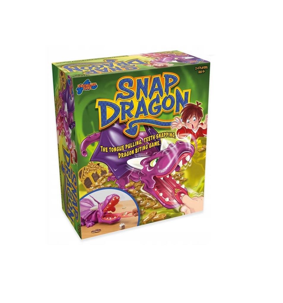 Rzuć kostkę, a następnie pociągnij język smoka tyle razy, ile oczek wypadło na kostce. Uważaj, smok może ugryźć ! A do tego umie wydłużyć szyję. Jeśli Ci się uda wygrywasz monetę, ale jeśli zatrzaśnie paszczę tracisz wszystkie monety, które udało Ci się zebrać. Wygrywa ten gracz, który jako...
