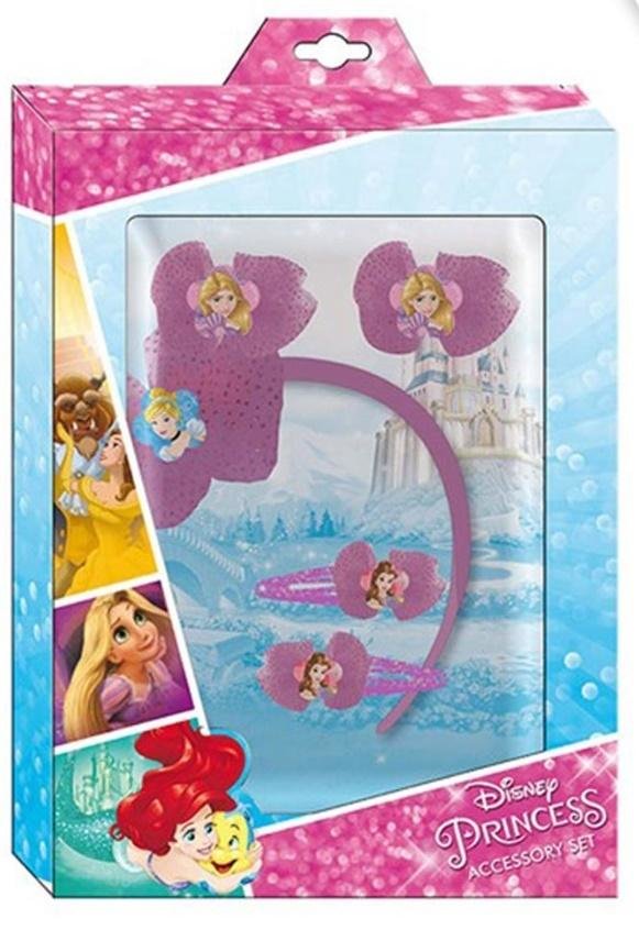 Księżniczki Disneya, Zestaw Akcesoriów do Włosów. Wspaniały zestaw ozdób do włosów z wizerunkami Księżniczek z bajek Disneya. Zawiera piękną, wielobarwną opaskę z brokatową kokardą. Komplet brokatowych, fioletowych spinek do włosów /2 szt./. Komplet brokatowych gumek z ozdobną kokardą /2 szt./.