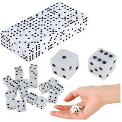Zestaw 100 klasycznych, białych kostek do gry to niezbędny dodatek dla wszystkich miłośników gier planszowych i towarzyskich. Każda kostka posiada standardowe oznaczenie od 1 do 6 oczek, co czyni je uniwersalnym akcesorium pasującym do wielu popularnych gier.