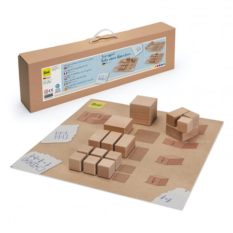 Gra edukacyjna wykonana z litego drewna bukowego została opracowana, aby w prosty sposób wprowadzić dzieci w temat dzielenia i ułamków. Młodsze dzieci uczą się związku między całościami, połówkami, ćwiartkami itp., bawiąc się trójwymiarowymi figurami. Starsze dzieci mogą lepiej poznać i zrozumieć pojęcie ułamków dzięki tym figurom. Ta bezpośrednia metoda nauki poprzez zabawę uczy dzieci, jak składać całość z różnych mniejszych figur na różne sposoby: np. połówka i dwie ćwiartki lub dwie ćwiartki i cztery ósme itp.Gra edukacyjna jest również szczególnie odpowiednia dla dzieci ze specjalnymi potrzebami.