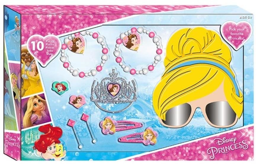 Księżniczki Disneya, Duży Zestaw Biżuterii z Okularami 3D. Kolekcja Disney Princess. Zestaw biżuterii z motywami z bajek Disneya. W zestawie: biżuteria, ozdoby do włosów oraz okulary 3D. Biżuteria: 2 bransoletki z barwnych koralików z 2 zawieszkami, kolczyki z klejnotami, oraz 2 sygnety. Ozdoby do włosów: 2 metalowe spinki, oraz ozdobny grzebień do upinania włosów. Okulary przeciwsłoneczne 3D - z wizerunkiem włosów Kopciuszka, idealne również na przyjęcie. Zapewniają 100% ochrony przed promieniowaniem UV (przepuszczalność światła 8-18%). Kolor: niebieski. Ciemne szkła