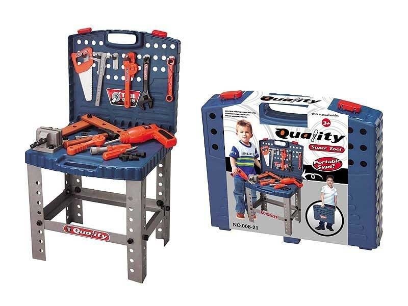 Duży zestaw narzędzi dla dziecka znajduje się w poręcznej walizce, która po złożeniu staje się stołem warsztatowym z pełnym niezbędnym wyposażeniem.