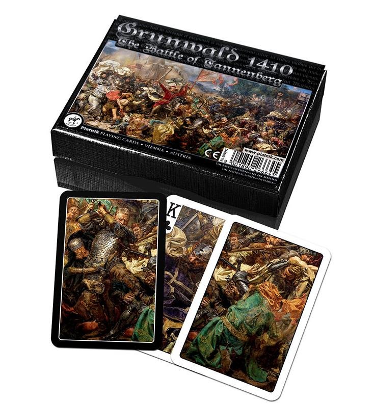 Karty wyprodukowane z okazji 600 rocznicy bitwy pod Grunwaldem. W komplecie 2 talie w eleganckim pudełku z charakterystyczną Piatnikowską poduszeczką. Na rewersach i figurach fragmenty obrazu Jana Matejki. Talie składają się z 55 plastikowanych kart o wymiarach 58 x 89 mm i gramaturze 310. Idealne zarówno do brydża, pokera, remika jak i innych gier.