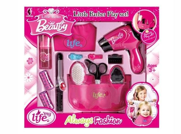 Zestaw fryzjerski, który zawiera: suszarkę na baterie, 3 spinki, szczotkę, nożyczki, lusterko, lokówkę, wałki do loków, pas fryzjerski. Produkt potrzebuje baterii 1 x "AA". Zabawka przeznaczona dla dzieci powyżej 3 roku życia.