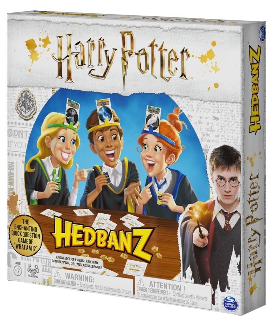 Mugole: sprawdźcie swoją wiedzę o Harrym Potterze w tej zabawnej grze towarzyskiej HedBanz! Magia zaczyna się, gdy gracze umieszczają karty na swoich opaskach HedBanz i kolejno zgadują, kim są. Gracze mogą zadawać pytania, na które można odpowiedzieć jedynie tak lub nie. Ponieważ w Hogwarcie nie wszystko jest tak, jak się wydaje, wykorzystaj żeton z magicznym eliksirem i zmień przebieg gry! W zależności od wykorzystanego żetonu może być konieczne odegranie scenki, rymowanie lub opisanie wskazówki. Zgadnij poprawnie, co znajduje się na Twojej karcie, a otrzymasz żeton na czekoladową żabę! Pierwsi gracze z 5 żetonami wygrywają! Czy podszkoliłeś się już z zaklęć? No to Accio Harry Potter HedBanz!