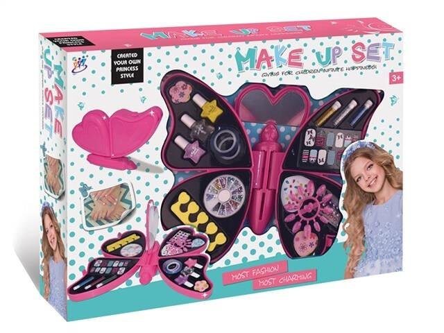 Malowidła w kształcie motylka, które zawierają: 3 lakiery do paznokci, pilniczek, zestaw koralików, 3 brokaty. Produkt nie potrzebuje baterii. Zabawka przeznaczona dla dzieci powyżej 3 roku życia.