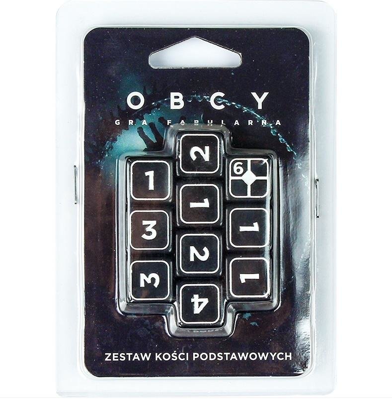 Zestaw kości podstawowychZestaw 10 ekskluzywnych kości podstawowych, stworzonych dla oficjalnego produktu licencyjnego OBCY Gra fabularna. Te specjalne, 16-milimetrowe kości zaprojektowano z myślą o wspieraniu zasad gry, lecz można ich też używać jako zwykłych kości sześciościennych.