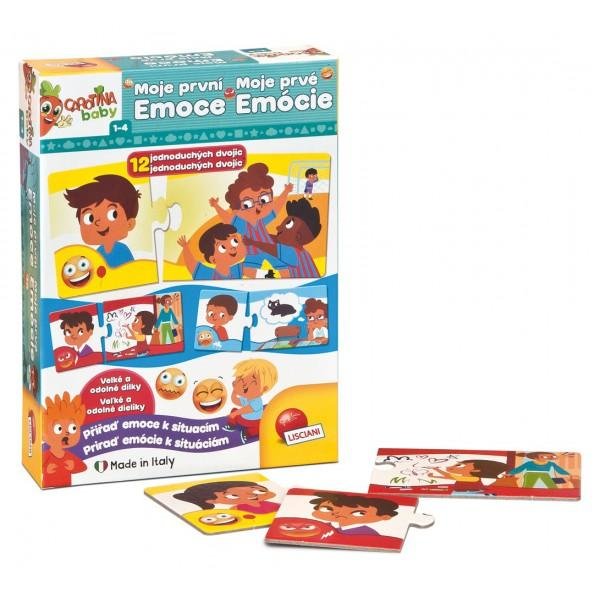Jednoduchá hra plná asociací pro malé děti. S pomocí obrázkových puzzle děti lépe porozumí emocím a přiřadí si je k situacím v běžném životě. Hra je vyrobena z materiálu, který je bezpečný pro nejmenší děti.12 jednoduchých dvojic - Přiřaď emoce k situacím.
