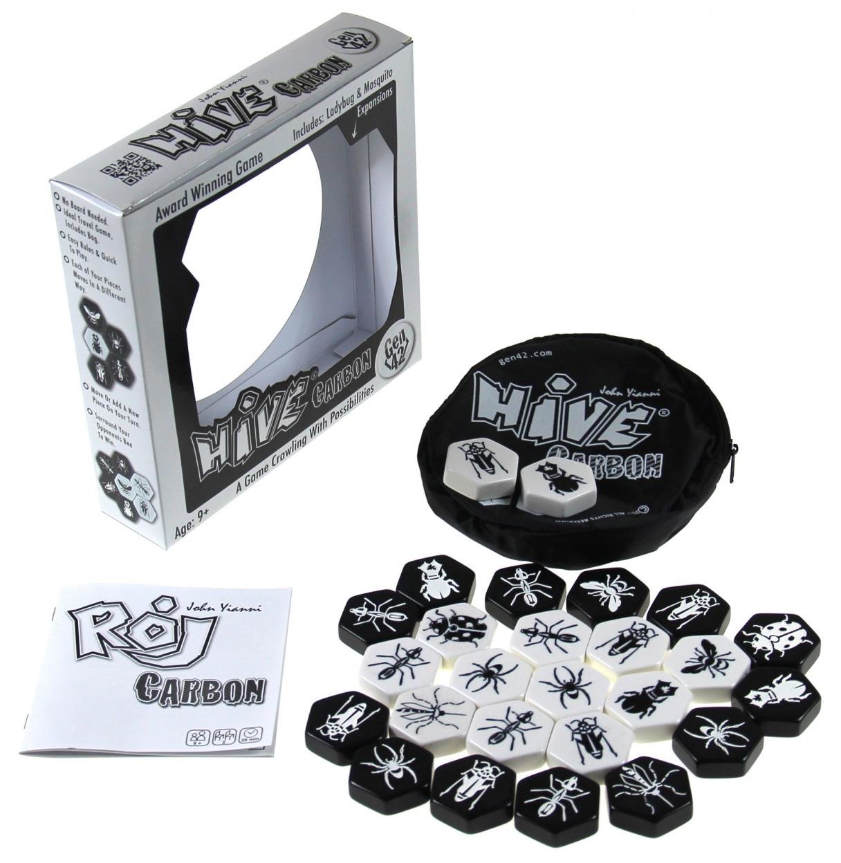 "Rój Carbon" to ekskluzywna wersja popularnej, znanej na całym świecie gry logicznej. To równie wspaniała gra, jak standardowa wersja, aczkolwiek w alternatywnej szacie graficznej. Jest to ukłon w stronę wszystkich miłośników klasycznej, czarno-białej kolorystyki. Nie będziemy opowiadać się po żadnej ze stron w dyskusji: "która wersja jest lepsza?", ale znamy opinię niektórych graczy, że Rój Carbon w końcu przypomina grę w szachy... Rój jest grą dla dwóch graczy. Każdy gracz ma trzynaście płytek, przedstawiających siedem różnych owadów: pszczoła (królowa), żuk, konik polny, pająk, mrówka, biedronka i komar. Ciekawostka: biedronka i komar są dodatkami, które zostały dołączone na stałe do wersji Carbon. W wersji standardowej, kolorowej Roju, trzeba je zakupić osobno. Celem gry jest otoczenie królowej przeciwnika. Gracze wykonują swoje ruchy na zmianę. W swoim ruchu mogą albo dołożyć owada do roju, albo przesunąć jedną z wcześniej zagranych płytek. Każda płytka posiada unikalny sposób poruszenia (jak w szachach), naśladujący ruch przedstawionego na niej owada. Na przykład, konik polny jest jedynym owadem potrafiącym przeskakiwać inne płytki. Proste reguły i ogromna ilość dostępnych kombinacji, sprawiają, że Rój jest prawdziwym wyzwaniem dla graczy, ceniących sobie intelektualną rozrywkę. Gracze muszą wykazać się umiejętnościami strategicznego planowania, taktycznego myślenia i wyobraźni przestrzennej. Kluczem do zwycięstwa jest sprytne atakowanie królowej przeciwnika i pozostawienie wystarczających odwodów do obrony własnej. Gra została wyróżniona wieloma prestiżowymi nagrodami. ZAWARTOŚĆ: 26 płytek 1 torba na płytki instrukcja
