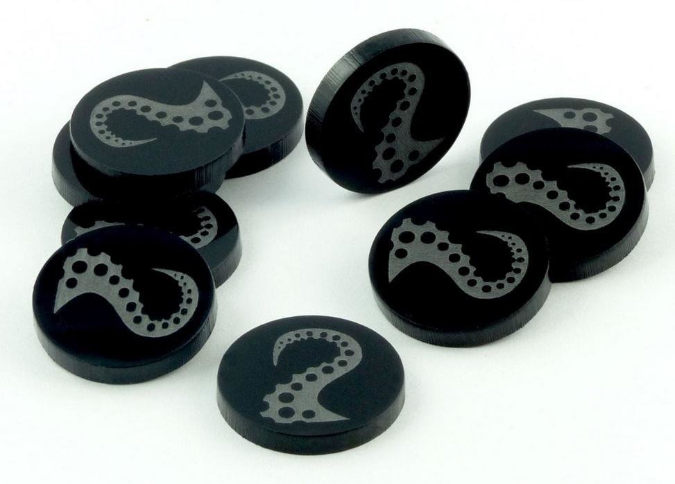 Żetony z wygrawerowaną grafiką macki w pierwszej wersji, wykonane z czarnego szkła akrylowego, o grubości 3 mm, średnica żetonu wynosi 22 mm. W opakowaniu jest 10 żetonów. Użyteczne w grach bitewnych, RPG, grach Print & Play, w prototypach gier planszowych, jako zamienniki elementów oraz przy wprowadzaniu własnych modyfikacji zasad do gier.