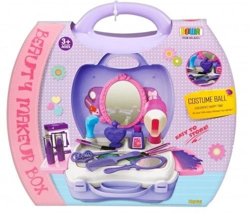 Toaletka posiada lustro, suszarkę do włosów, grzebienie, spinki do włosów oraz wiele innych akcesoriów potrzebnych do wykonania porannej toalety. Zestaw zapakowany jest w wygodną i podręczna walizkę dzięki czemu można ją zabrać ze sobą wszędzie. Posiada 21 elementów. Produkt wykonany z plastiku....
