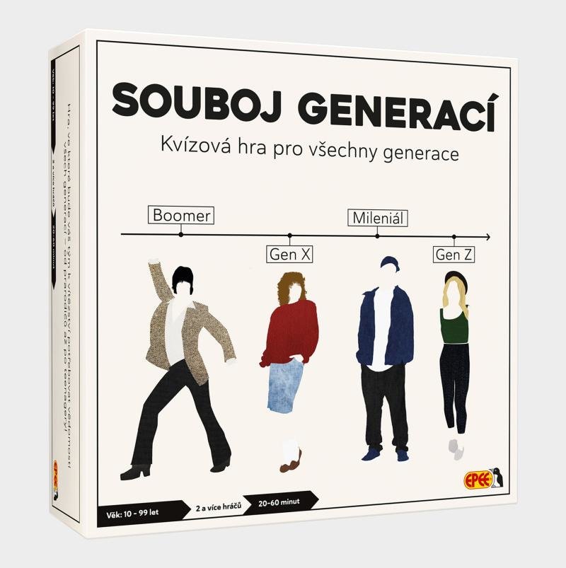 Jedinečná kvízová hra pro dva a více hráčů, která prověří vaše znalosti z různých oblastí lidského života. Není to tak jednoduché, otázky se týkají jak významných událostí, kultury nebo také světa reklamy, módy a různých trendů za posledních skoro sto let. Otázky jsou rozdělené do čtyř časových skupin - Boomer, generace X, mileniálové, generace Z. Hráči mohou hrát samostatně nebo v týmech. Pozor na karty Výzva, kde jde o prověření důvtipu a schopností. Generace nebojují proti sobě, bojují proti sobě jednotlivá časová období. Hráči: 2 a více. Doba hraní: 20 - 60 minut. Pouze pro český trh. Pro děti od 10let.