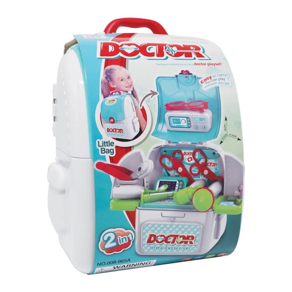 Mały doktor w plastikowym plecaku