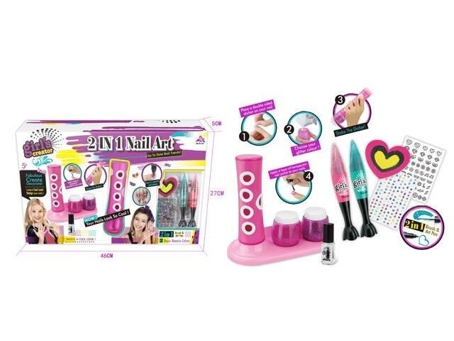 Zestaw do ozdabiania paznokci. Akcesoria: suszarka do paznokci, 2 lakiery, pilniczek, naklejki na paznokcie, koraliki na paznokcie, brokat. Produkt nie potrzebuje baterii. Zabawka przeznaczona dla dzieci powyżej 5 roku życia.