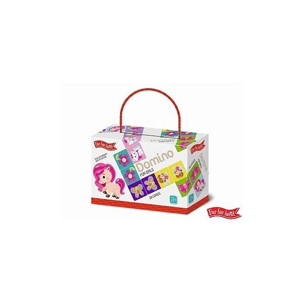 Far Far Land Domino s obrázky pro dívky. Balení obsahuje 28 karet. Hra pro 2-5 hráčů. Při hře 2 hráčů každý hráč dostane 7 karet. Při hře více hráčů každý dostane 5 karet. Zbývající karty jsou v banku.“ Hráč, který má "dvojitou" kartu (kartu s totožnými obrázky), hraje první. Pokud žádný z hráčů nemá dvojitou kartu, každý hráč si vezme jednu kartu z banku. Pokud má více hráčů dvojitou kartu, začíná ten mladší. Pro rozehrání prvního tahu si však můžete vymyslet svá vlastní pravidla. Hráči se střídají a jeden za druhým přikládají karty ze své ruky ke kartám na hrací ploše se shodným obrázkem. Pokud hráč nemá shodný obrázek, musí si vzít kartu z banku. Hráč, který položí svou poslední kartu na hrací plochu, vyhrává. Pokud všichni hráči mají v ruce karty, ale není možné hrát dál, hra je ukončena "blokem" a vyhrává hráč, který má v ruce nejmenší množství karet. Věk: 3+"