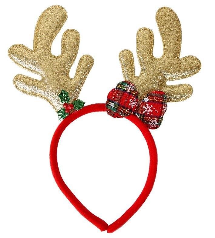 Świąteczna Opaska Do Włosów Brokatowe Rogi Renifera z kokardą i jemiołą Opaska z rogami renifera znakomicie sprawdzi się podczas świątecznych stylizacji. Posiada uniwersalny rozmiar przez co pasuje zarówno na dzieci jak i dorosłych. Z naszą opaską dodasz świątecznego akcentu swoim stylizacjom. Opaska powleczona czerwonym, miłym w dotyku materiałem. Uszy Renifera wykonane są z brokatowego materiału, wypełnione sztywną gąbką przez co ładnie się prezentują i nie odkształcają. Opasce uroku dodają dwie aplikacje: kokarda w czerwoną kratkę oraz listki jemioły. Wymiary opakowania: 25 cm x 20 cm x 1 cm Znakomity pomysł na prezent !