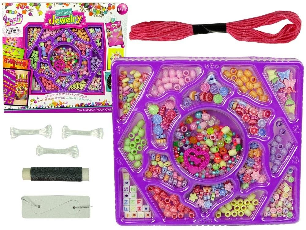Zestaw składa się z 17 różnych elementów, koralików i zawieszek. Wybór jest ogromny, w różnych kolorach i wzorach, kwiatki, kuleczki. Do zestawu dołączone są sznurki, na które wystarczy nawlec koraliki. Dziewczynka będzie mogła stworzyć swoją wymarzoną bransoletkę lub wisiorek! A kto wie, może sprawi najcenniejszy prezent mamie lub babci? Wykonaną od serca biżuterią.