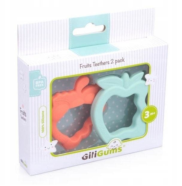 Zestaw silikonowych gryzaków w uroczym, owocowym wydaniu zapewni podwójną pomoc w ząbkowaniu. Gryzaki łączą w sobie walory estetyczne i praktyczne. Ozdobione wypustkami, podczas gryzienia delikatnie masują dziąsła, a ich kształt oraz otwór ułatwiają małym rączkom chwytanie gryzaków. Wykonane w 100% z bezpiecznego silikonu