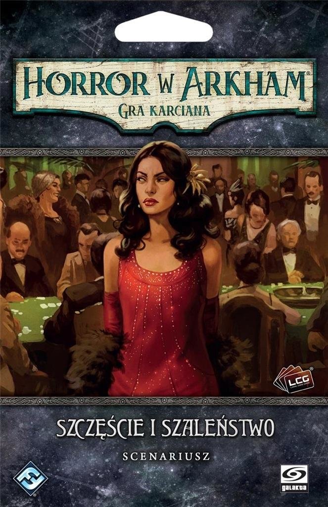 Szczęście i szaleństwo: Kasyno w Monte Carlo wykorzystuje moce pozwalające manipulować prawdopodobieństwem, aby zgromadzić bogactwa kosztem bezpieczeństwa zwykłych ludzi. Wraz z innymi badaczami musisz wykraść źródło mocy kultu i położy kres ich nikczemnej działalności. Czy w wyniku intrygi szczęście odwróci się na waszą korzyść? A może opuści was na zawsze? Mamy przyjemność zapowiedzieć Szczęście i szaleństwo, kolejny dodatek do Horroru w Arkham: Gry karcianej! W tym emocjonującym scenariuszu od 1-4 badaczy musi zaplanować i przeprowadzić śmiały skok na kasyno. Waszym celem jest Źródło szczęścia, tajemniczy artefakt, który pozwala manipulować szczęściem (dosłownie) i przechylać jego szalę na swoją korzyść. Podobnie jak w przypadku wcześniejszych scenariuszy, także i ten możecie rozegrać zarówno jako osobno, jak i wplatając go w dowolną kampanię. Co więcej, część zawartości zyska dodatkowe efekty jeśli wykorzystacie ten dodatek jako historię poboczną w kampanii Szkarłatne klucze!
