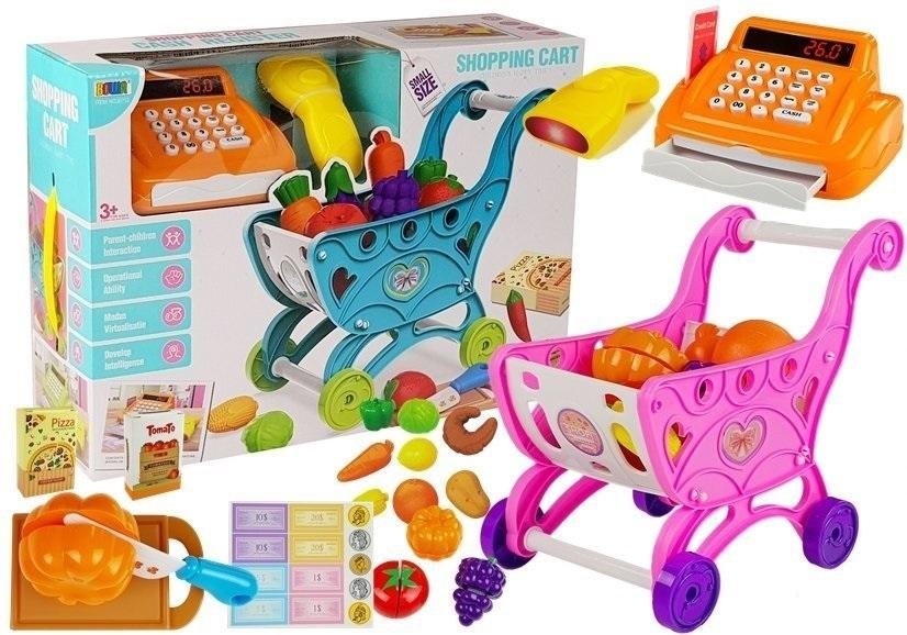 Market Wózek Sklepowy Kasa Fiskalna Akcesoria Zabawa w sklep jest jedną z najpopularniejszych rozrywek dzieci w różnym wieku. Taka forma spędzania czasu pozwala na naukę liczenia i negocjacji. Zabawkowa kasa fiskalna to ciekawa propozycja na rozwijanie w dziecku chęci do nauki podstaw matematyki w bardzo przyjemny sposób. Kasa sklepowa z wózkiem i akcesoriami będzie doskonałym uzupełnieniem umożliwiającym jeszcze ciekawszą i lepszą zabawę, a także kolorowym i przyjemnym akcentem w wystroju pokoju dziecięcego, czy sali zabaw. Przedstawiony model jest bezpieczną zabawką, ponieważ do produkcji zabawkowej kasy sklepowej użyto materiałów najwyższej jakości posiadających wszelkie wymagane certyfikaty. Design zabawki jest bardzo nowoczesny. Opływowy kształt kasy doskonale współgra z jej intensywnym kolorem, przez co na pewno przyciągnie wzrok dziecka, zachęcając tym do zabawy. Wysuwana szuflada, oraz atrapy : skaner produktów i wyświetlacz to tylko jedne z wielu zalet tego sprzętu. Wraz z zabawką młoda kasjerka bądź kasjer otrzymają: - wózek Sklepowy - akcesoria spożywcze: pomidor, marchewka, cytryna, pomarańczą, kukurydza, rogal, kapusta, dynia - atrapa czytnika produktów, - kasa fiskalna, deska do krojenia, nóż -kartonowe monety i banknoty. Szereg różnorodnych akcesoriów umożliwi dziecku stworzenie własnego sklepu z szerokim asortymentem, co pozwoli mu na rozwijanie wyobraźni i dokładne wcielenie się w rolę kasjera. Zestaw młodego sprzedawcy zapakowany jest w ozdobne, barwne pudełko, dzięki czemu doskonale nadaje się na prezent. By uruchomić kasę fiskalną należy użyć trzech baterii AA, które nie są dołączone do zestawu. Wymiary elementów wchodzących w skład zestawu dla kasjera: - kasa fiskalna: 14 cm x 11 cm x 7cm - wózek sklepowy: około 28 cm x 24.5 cm x 18 cm Wymiary opakowania: 40 cm x 28 cm x 12 cm