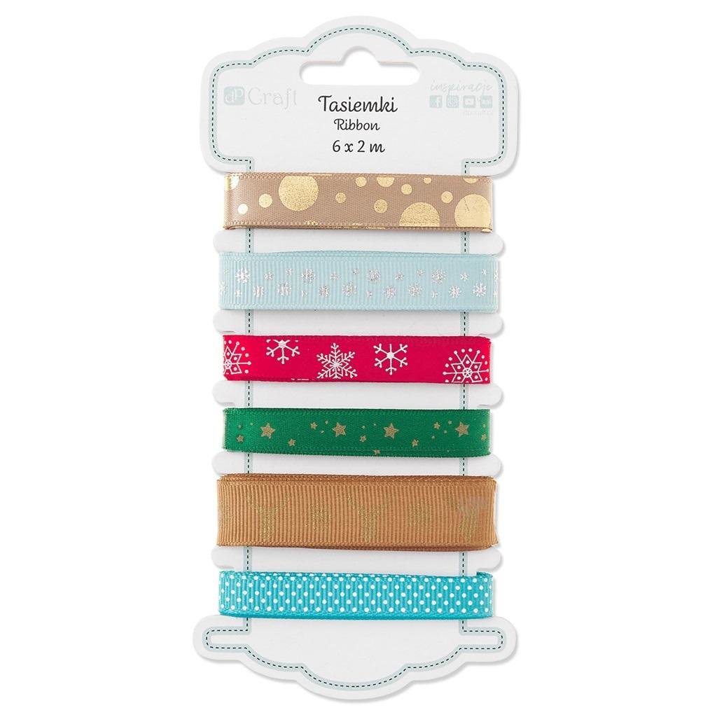 Zestaw satynowych i rypsowych tasiemek w zimowo-świątecznych kolorach z motywami śnieżynek, gwiazdek, jelonków i mniejszych oraz większych kropek.