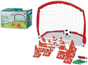 W zestawie: elementy do złożenia bramki o wymiarach 94 x 75 x 48 cm., 12 pachołków, gumowa piłka nożna, pompka do piłki, 4 kołki uziemiające, wym. opakowania: 30 x 18 x 14 cm., 3+