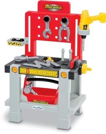 Warsztat mechanika zawiera 16 akcesoriów w tym wiertarko-wkrętarkę z wymiennymi końcówkami, młotek, kombinerki oraz koszyk do przechowywania narzędzi. Wyprodukowane we Francji. Wymiary: 48x25,7x61,5 cm, 18m+