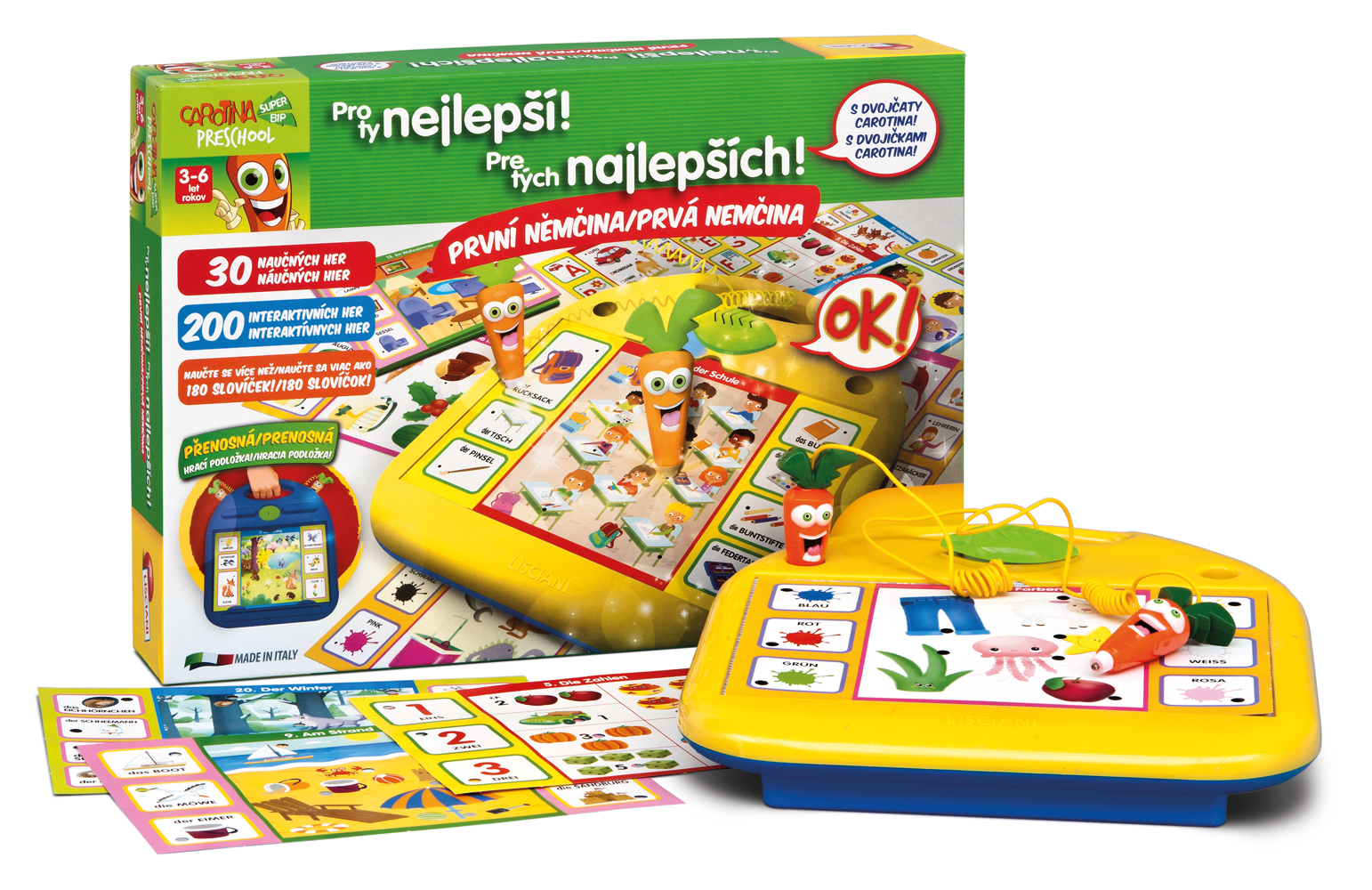 Moje první němčina - zábavná elektronická naučná hra. Dvojčata Carotina vydávají při každé správné kombinaci veselé zvuky! Tato naučná hra z řady naučných her Carotina zahrnuje více než 200 na sebe navazujících her a je určená pro děti od tří let. Nauč se hravou formou abecedu, čísla, barvy a spoustu dalšího - a to vše v němčině.