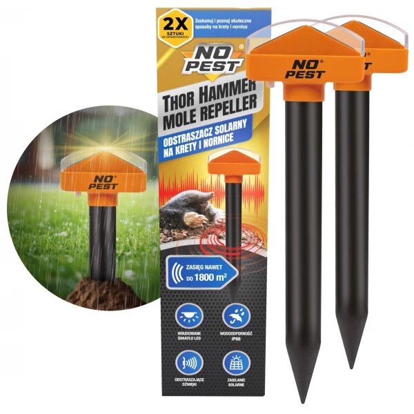 NO Pest Solární odpuzovač krtků a hrabošů Thor Hammer je ideální řešení, pokud chcete účinně a ekologicky zabránit škodám, které působí krtci, hraboši a další hlodavci na vaší zahradě nebo trávníku. S extrémně velkou pokrytou plochou až 1800 m² zajistí spolehlivou ochranu rozlehlých prostor bez použití chemických prostředků.