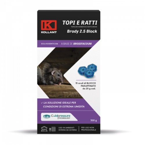 Brody 2,5 Block je nástraha ve formě parafinových bloků na hubení hlodavců, připravená k přímému použití. Vhodné pro použití do vlhkého prostředí. Úhyn hlodavce trvá několik dní po pozření nástrahy proto, aby ostatní hlodavci nepojali podezření a taktéž nástrahu zkonzumovali.