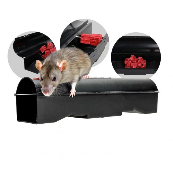 Deratizační stanice o délce 33 cm je designovaná tak, aby zabránila náhodnému kontaktu lidí a domácích zvířat s toxickým jedem na krysy. Díky pevnému uzavření západkou a přídavným šroubem je jed v bezpečí i před dětmi a mazlíčky. Krmítko zároveň chrání jed před nepříznivým počasím, takže zůstává suchý a účinný po dlouhou dobu. Speciální konstrukce s ochrannými prahy zajišťuje, že jed nevyklouzne ani při upevnění k zemi.
