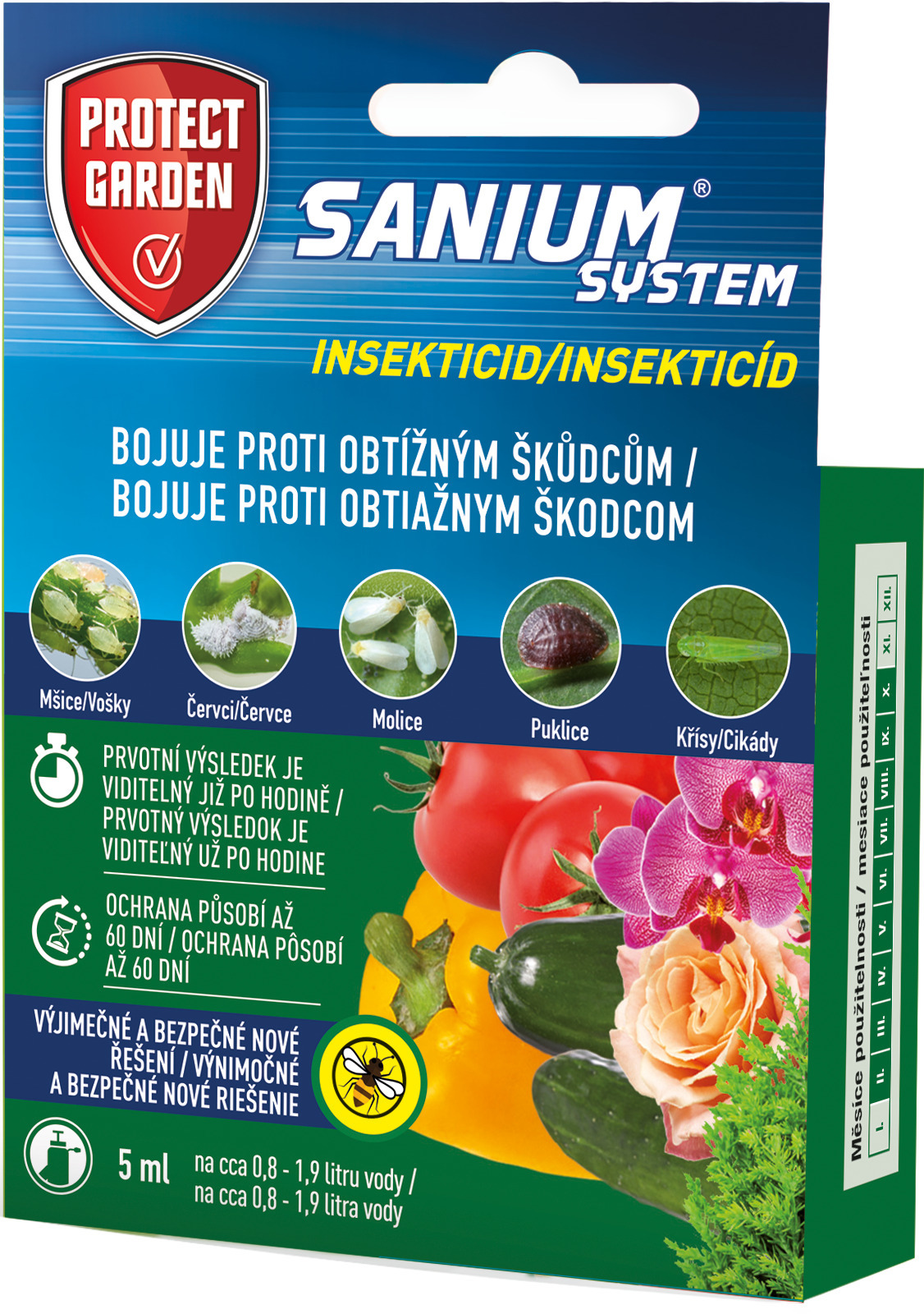 Produktem můžete ošetřit široké spektrum rostlin od okrasných květin, přes zeleninu až po révu vinnou nebo jabloně. Výhodou je také šetrnost k životnímu prostředí, protože Sanium System je bezpečný pro včely, což je velký benefit oproti některým jiným insekticidům.