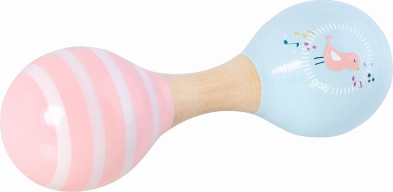 Uniwersalna kolorystyka dwustronnych drewnianych marakasów Ptaszek Goki będzie odpowiednia dla dziewczynki lub chłopca. Grafika z rozśpiewanych ptaszkiem spodoba się miłośnikom zabaw z motywem zwierząt.