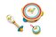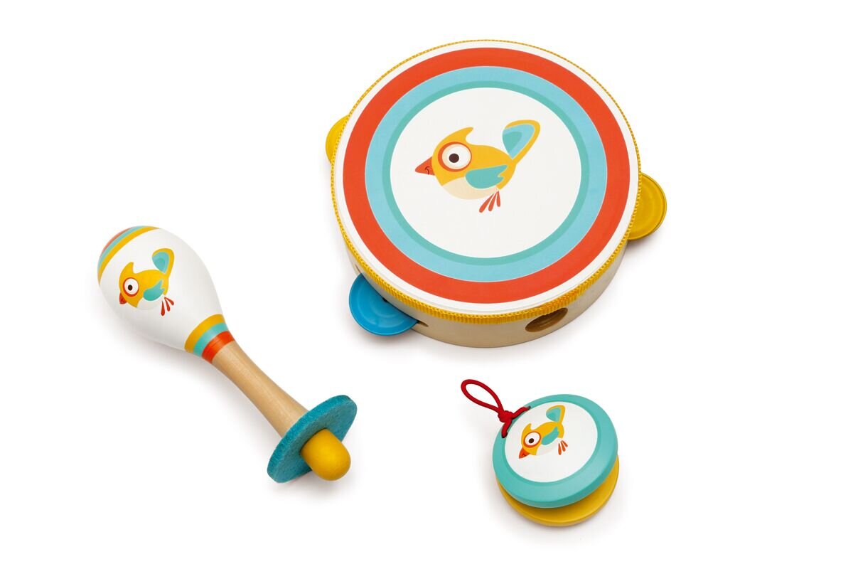 Roztomilá sada hudebních nástrojů s motivem ptáčka obsahuje tamburínu, rumba kouli a kastaněty.