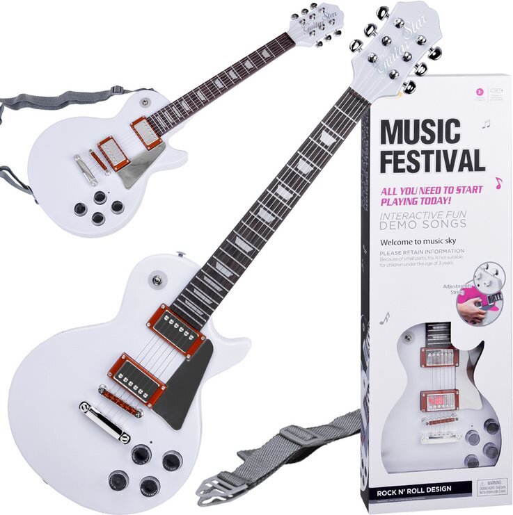 Tato bílá elektrická kytara je navržena tak, aby maximálně odpovídala skutečnému nástroji. Vyrobena z kvalitního plastu a vybavena kovovými strunami, umožňuje dětem zažít autentickou hudební atmosféru. Zejména oceníte dva provozní režimy: aktivní struny, kdy dotek strun vyvolá melodické tóny s možností výběru různých zvuků, a režim hraní melodií, který umožňuje přehrávání přednastavených písní s jednoduchou změnou pomocí tlačítka. Díky délce 69 cm a přizpůsobitelnému popruhu (cca 99 cm) je kytara ideální pro děti všech věkových kategorií. Pro provoz jsou potřeba 3 baterie AA 1,5 V (není součástí balení).