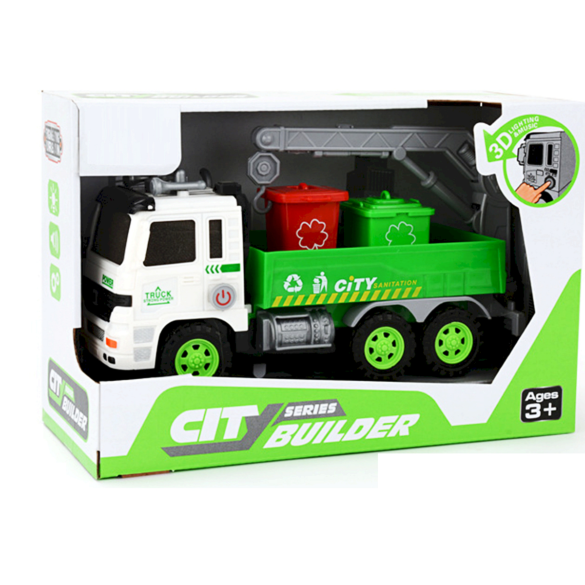 Śmieciarka z żurawiem posiada interaktywne funkcje zabawy: światło oraz dźwięk. Na obudowie kabiny znajduje się przycisk uruchamiający opisane funkcje.
