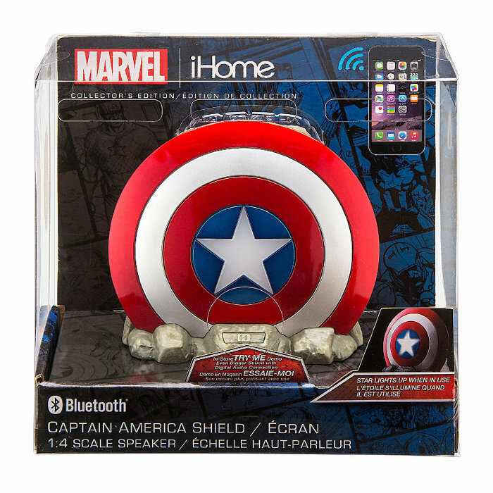 Głośnik Bluetooth Tarcza Kapitana Ameryki w skali 1:4! Odtwarzaj muzykę bezprzewodowo do 10m. Świetna jakość dźwięku. Możliwość odbierania i kończenia rozmowy poprzez zestaw głośnomówiący. Gwiazda na tarczy rozświetla się w trakcie użwania. Bateria akumulator.