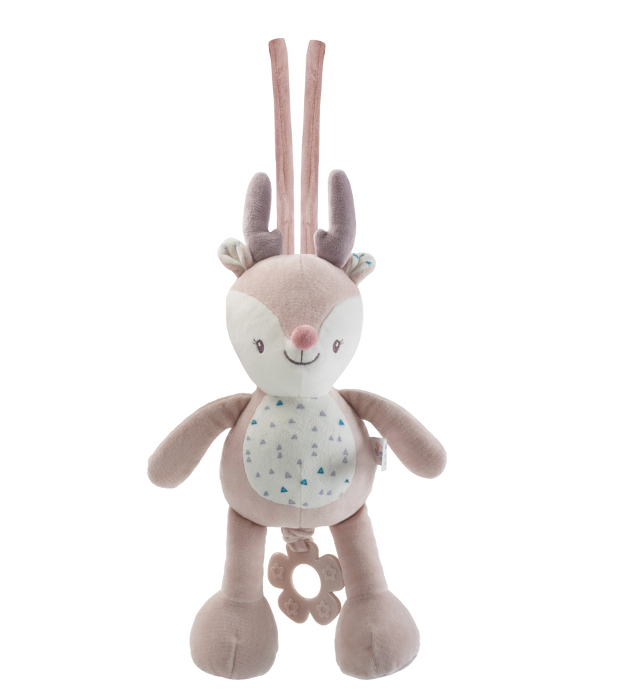 Závěsná hračka se zvukem srnka Suzi potěší každého prcka. Díky více funkcím stimuluje smysly děťátka. Kousátko zklidní dítě při prořezávání prvních zoubků. Po zatažení hračky se ozve uklidňující melodie. Díky závěsným šňůrkám lze hračku pověsit kamkoli budete potřebovat.