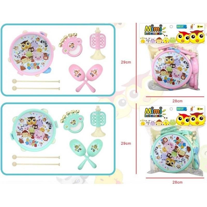 Zestaw instrumentów muzycznych zapakowany w woreczek z papierową pzrywieszką. W skład zestawu wchodzi bębenek z pałeczkami mini trąbka 2szt marakasów i tamburyn. číst celé