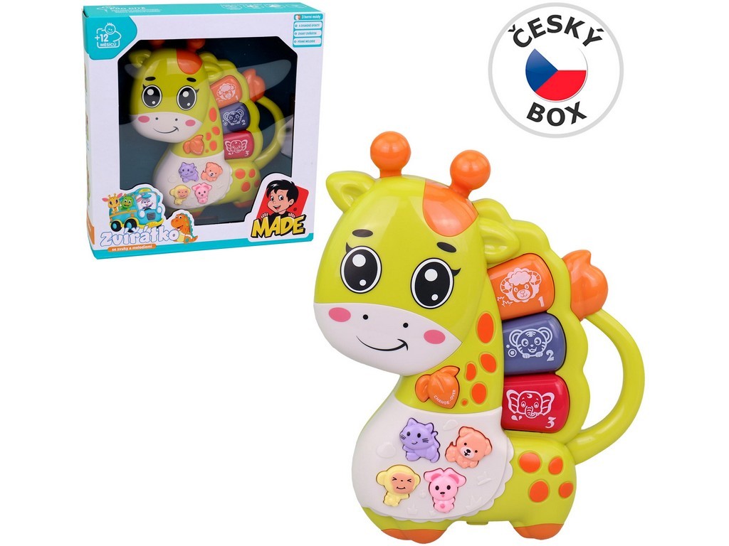 Piánko žirafa, se světlem, hudbou a zvukem, na baterie, 13,5 x 3,5 x 16 cmHračka je určena pro děti 12M+.Rozměr hračky je 13,5 x 3,5 x 16 cm.Materiál hračky je plast.Balení hračky je window box.Produkt je určený pro kohokoliv.Ke zprovoznění produktu jsou potřeba 2 AAA baterie.Baterie nejsou...