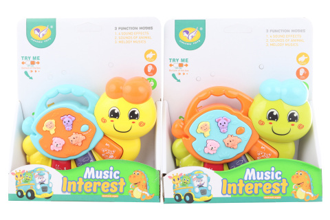 Plastové piánko ve tvaru šneka. Hraje a vydává zvuky zvířátek. Napájení na 2 AAA baterie (jsou součástí balení). Rozměry piánka cca 15 x 11,5 cm. Rozměry balení cca 16 x 19 x 5 cm. Věk 12m+