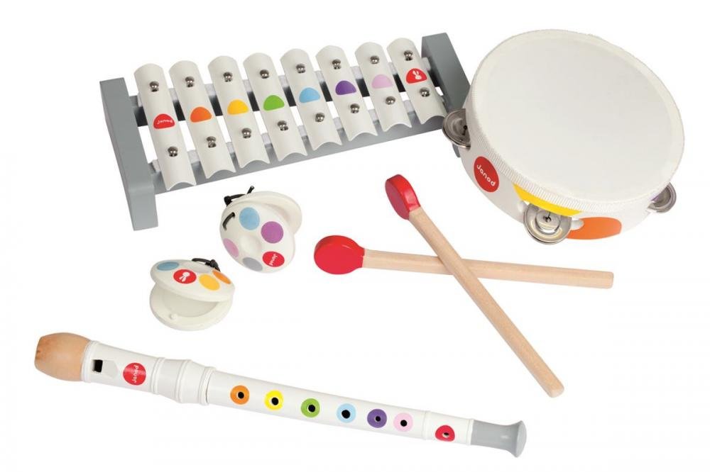 Dřevěná sada hudební nástroje pro děti Confetti Janod flétna-tamburína-xylofon-kastaněty
