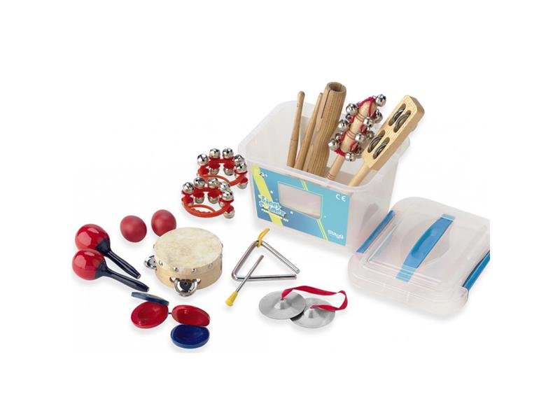 Dětská perkusní sada. Obsahuje: 1x rolničky na dřevěné paličce, 1x 4" dřevěná mini tamburína s 1 řadou plíšků, 1 x triangl s paličkou, 1x dřevěné dvojité mini guiro s paličkou, 2x mini zvonkohru na plastovém rámu, 1 x zvonky na dřevěném rámu, 1x pár dřevěných castanět, 1x pár činelků, 1x pár plastových mini maracas, 1x pár plastových vajíčkových shakerů. V plastové krabici, hmotnost 1,3 kg.