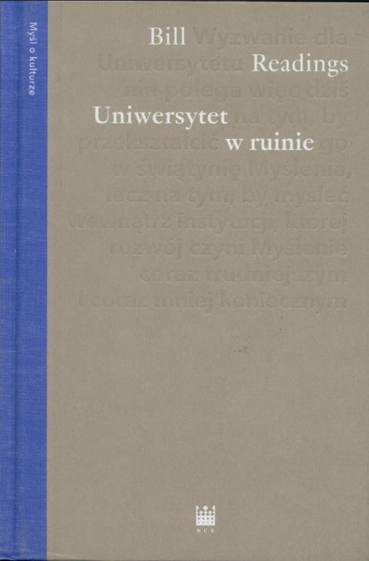 Bill Readings (1960-1994), brytyjski literaturoznawca, profesor komparatystyki na Uniwersytecie w Montrealu. Zginął w wypadku, nim ukazała się drukiem jego książka Uniwersytet w ruinie. Badając kondycję uniwersytetu u progu XXI w., autor stawia nas przed wyborem: czy iść na ustępstwa wobec korporacyjnej rzeczywistości, w której uczony staje się biurokratą, a student świadomym konsumentem, czy pogrążać się w romantycznej nostalgii, pozostając w ruinach "dawnego" uniwersytetu.