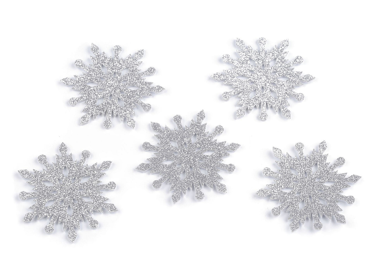 Filcové vločky zdobí z jedné strany třpytivé glitry. Druhá strana je filcová. Využijete je k aranžování, např. svátečního stolu, ale hodí se také na přilepení na vánoční věnce a podobné dekorace. Můžete jimi ozdobit i krabičky, květináče, truhlíky apod. Dají se pomocí šňůrky zavěsit jako ozdoba stromečku. Šňůrky nejsou součástí balení.