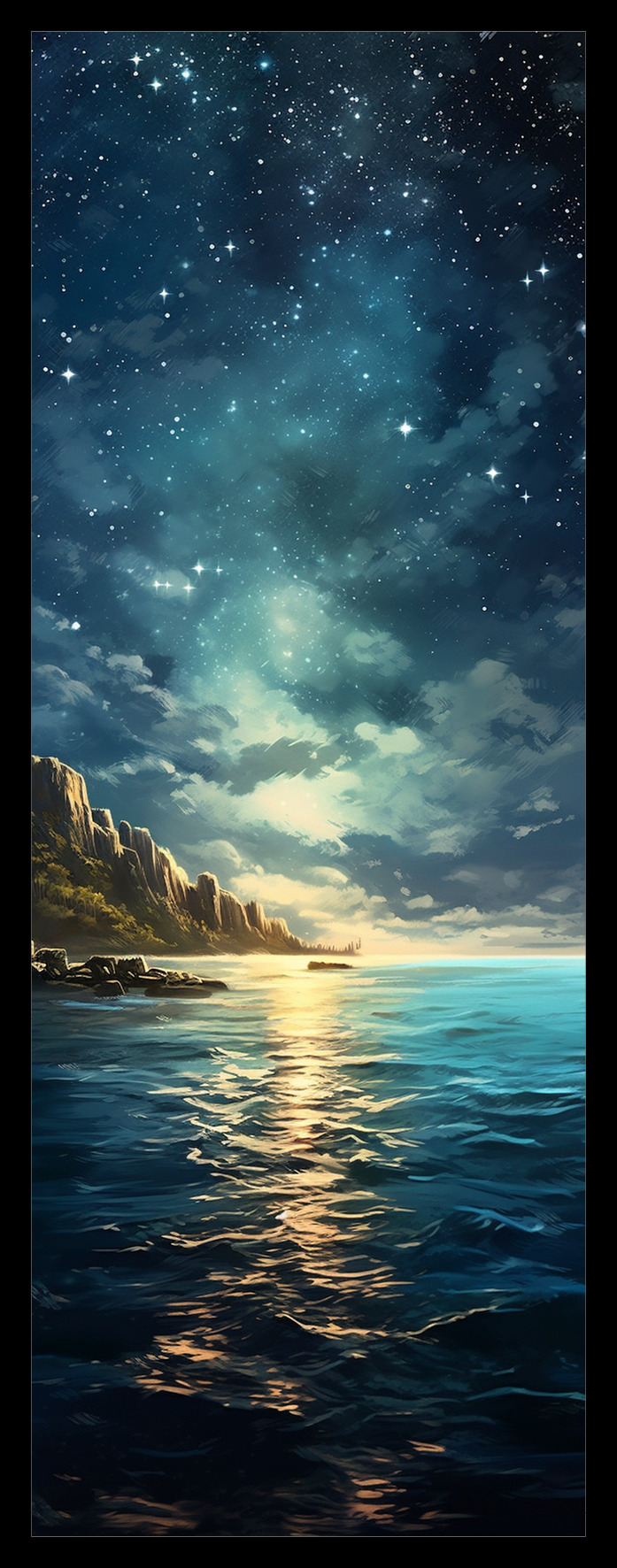 - Detailní ilustrace noční mořské krajiny s útesem a hvězdami.