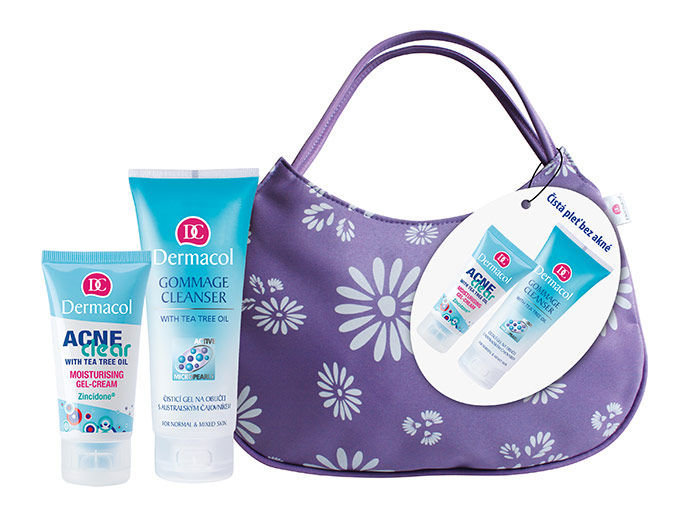 **Dermacol AcneClear Moisturising Gel-Cream Kit 7025** kazeta pro problematickou pleť. **Složení kazety**: **AcneClear Moisturising Gel-Cream 50ml - Hydratační gel-krém na pleť se sklonem k akné** Hydratační gel-krém pro denní i noční péči o problematickou pleť se sklonem k akné. Speciální receptura nemastného gel-krému nezatěžuje pokožku a neucpává póry. Zincidone® reguluje tvorbu kožního mazu. Olej z australského čajovníku, působí antisepticky a dezinfikuje pleť. Pokožka zůstává jemná a vláčná. Dermatologicky testováno **Výsledek**: Hydratovaná pleť bez akné. **Použití**: Naneste na obličej a pečlivě rozetřete. **Gommage Cleanser With Tea Tree Oil 100ml - Čistící gel na obličej s australským čajovníkem pro všechny typy pleti** Jemný čistící gel s Tea tree olejem pro každodenní odstranění odumřelých buněk z pokožky. Obsahuje mikroperličky, které mají schopnost na sebe nabalovat odumřelé kožní buňky (tzv. jemná gommage). Pokožku nedráždí a nepoškozují kožní film. Po použití gelu je pleť svěží, projasněná a jemně vyhlazená. **Použití**: Gel naneste na dostatečně navlhčený obličej. Krouživými pohyby lehce masírujte pokožku, až se vytvoří jemná pěna. Poté opláchněte vodou. Nepoužívat v okolí očí.